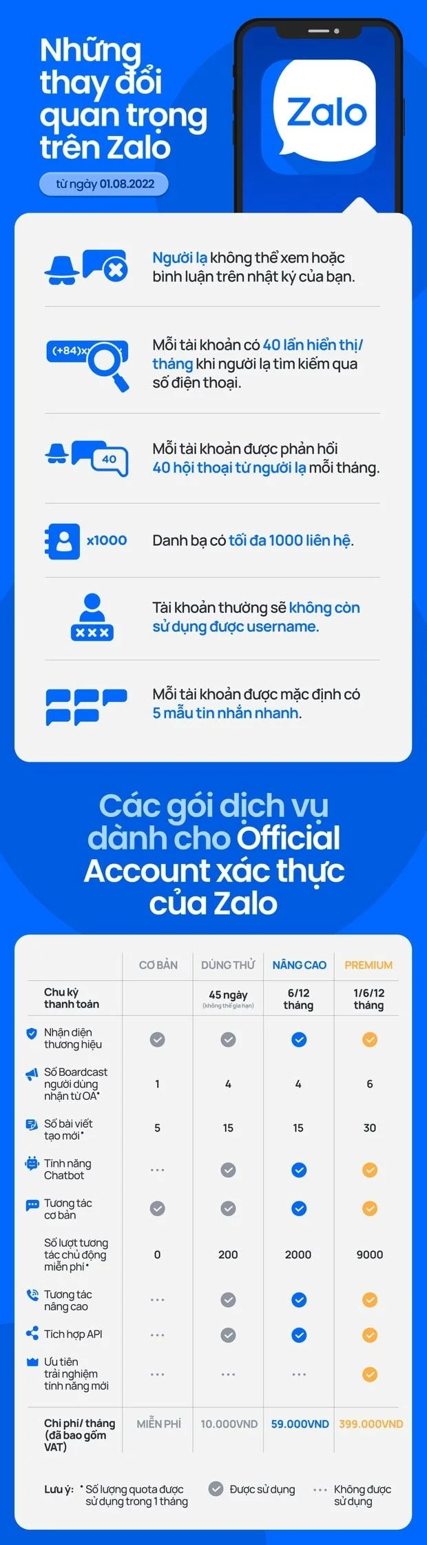 Cụ thể, bắt đầu từ ngày 1/8/2022, Zalo chính thức triển khai 3 gói thuê bao tháng cho người dùng tại Việt Nam. Trong đó, bao gồm gói trả phí dành cho doanh nghiệp (dạng tài khoản OA Doanh Nghiệp) sẽ gồm Dùng thử (10.000 đồng), Nâng cao (59.000 đồng) và Cao cấp (399.000 đồng).